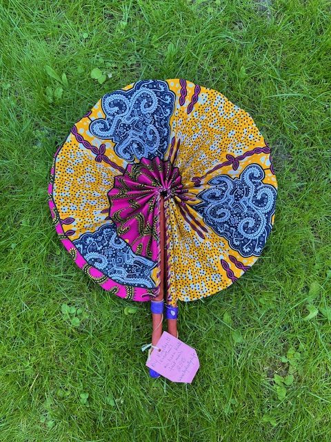 Eventail en tissu Kinté coton et manche solidifié en cuir est fabriqué artisanalement au Ghana, cet éventail qui se glisse facilement dans le sac à main, est un allié indispensale pour les périodes estivales.