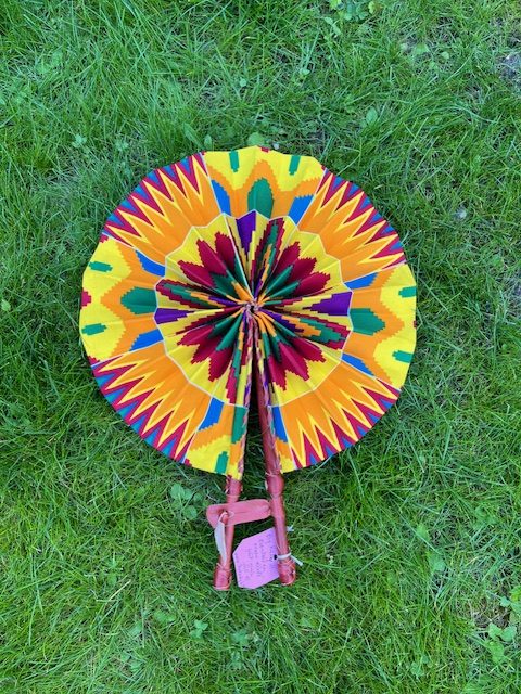 Eventail en tissu Kinté coton et manche solidifié en cuir est fabriqué artisanalement au Ghana, cet éventail qui se glisse facilement dans le sac à main, est un allié indispensale pour les périodes estivales.