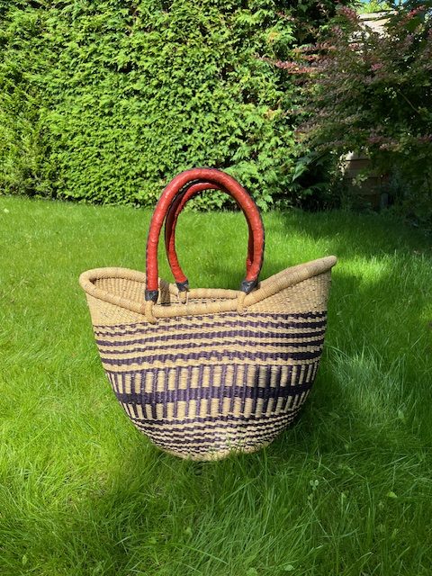 Les paniers traditionnels bolga avec des anses en cuir, sont tressés à la main au Ghana dans la région de Bolgatanga, avec une herbe de la savane, communément appelée, herbe à éléphant. La vannerie de Boltanga est une activité dédiée principalement aux femmes, mais elle est aussi pratiquée par des hommes, car c’est devenu une activité génératrice de revenus et de d’emplois. Ce panier sera un excellent choix pour sa qualité de fabrication artisanale, son charme remarquable et sa bonne conception et le tout à un prix très raisonnable, vu la qualité et l’origine de fabrication. Pour des raisons d’éthique, nous respectons les principes du commerce équitable dans le cadre de notre collaboration avec les fabricants.