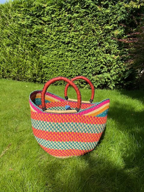 Les paniers traditionnels bolga avec des anses en cuir, sont tressés à la main au Ghana dans la région de Bolgatanga, avec une herbe de la savane, communément appelée, herbe à éléphant. La vannerie de Boltanga est une activité dédiée principalement aux femmes, mais elle est aussi pratiquée par des hommes, car c’est devenu une activité génératrice de revenus et de d’emplois. Ce panier sera un excellent choix pour sa qualité de fabrication artisanale, son charme remarquable et sa bonne conception et le tout à un prix très raisonnable, vu la qualité et l’origine de fabrication. Pour des raisons d’éthique, nous respectons les principes du commerce équitable dans le cadre de notre collaboration avec les fabricants.