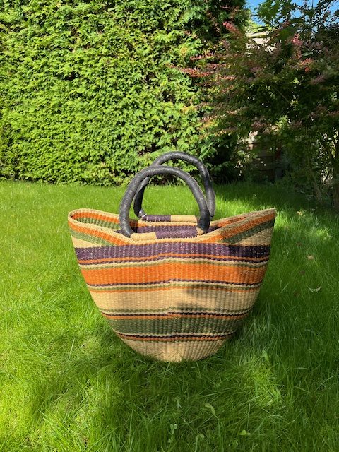 Les paniers traditionnels bolga avec des anses en cuir, sont tressés à la main au Ghana dans la région de Bolgatanga, avec une herbe de la savane, communément appelée, herbe à éléphant. La vannerie de Boltanga est une activité dédiée principalement aux femmes, mais elle est aussi pratiquée par des hommes, car c’est devenu une activité génératrice de revenus et de d’emplois. Ce panier sera un excellent choix pour sa qualité de fabrication artisanale, son charme remarquable et sa bonne conception et le tout à un prix très raisonnable, vu la qualité et l’origine de fabrication. Pour des raisons d’éthique, nous respectons les principes du commerce équitable dans le cadre de notre collaboration avec les fabricants.